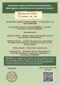 A Rede PENSSAN promove no dia 8 de dezembro (sexta-feira), a partir das 14h, o webinário “Alimento e água são direitos fundamentais: abordagens humanitárias em contextos de guerra”. A atividade será realizada pela plataforma Zoom, com acesso restrito às pessoas filiadas à Rede – é preciso se inscrever previamente neste link. O público em geral poderá assistir ao encontro pelo nosso canal no YouTube.